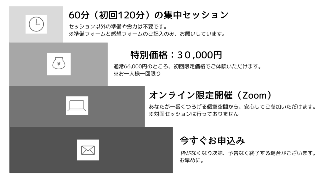 ※本セッションは医療行為ではありません。心身の症状で通院中の方は主治医にご相談のうえお申し込みください。
